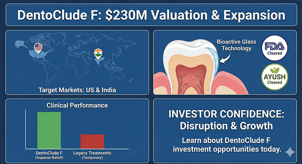 Cumberland Biotherapeutics developed DentoClude F® technology with bioactive glass with Fluoride, particle size of <1 µm that contains botanicals with anti-infective & anti-inflammatory active extracts. DentoClude F® is approved by the US FDA, USA and DCGI/ AYUSH, India. DentoClude F® is available only through your Dental Provider. DentoClude F®, a NOVEL device with Bioactive Glass that blocks dentin tubules and prevents micro-leakage resulting in a decrease in sensitivity at root surface exposed due to periodontal disease or post periodontal therapy as well as periodontal and implant bone regeneration.